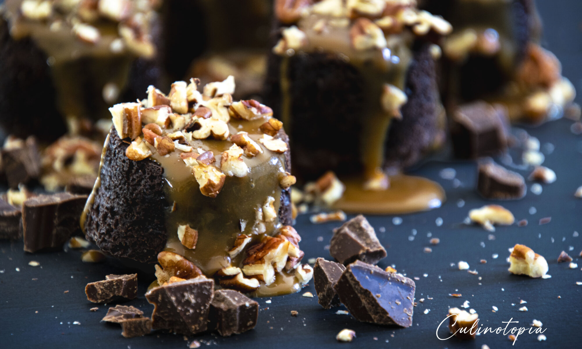 Non, en fait, c’est en référence à une friandise américaine: les Turtles. Ce sont des petits bonbons à base de noix de pécan et de caramel, enrobés de chocolat. Alors, ici, on oublie la forme et on se concentre sur le goût. Et vu comme ces petits bouchons sont bons, ça donne presque envie de faire un petit voyage outre-Atlantique pour en déguster. Naannn, je ne le ferai pas. Pas pour un prétexte aussi futile déjà, et ensuite surtout pas en ce moment. J’attendrai un chef d’état moins 🤬