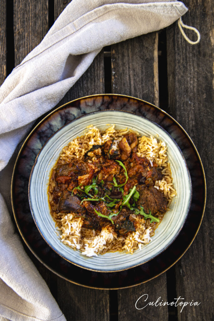 - Quelques minutes avant de servir, ajouter les feuilles de roquette et les laisser se flétrir quelques minutes. Servir avec du riz basmati.