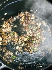 - Ajouter les oignons à la cocotte, en grattant le fond pour récupérer tous les sucs de viande. Après 5/7 minutes, ajouter l'ail, le gingembre et le piment et sauter le tout encore 1 minute.