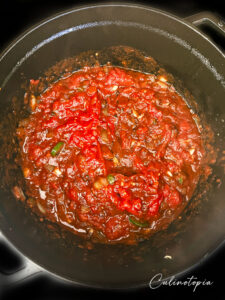 - Écraser les tomates entière sur le dessus, et verser leur jus. Encore une fois, bien gratter le fond pour déglacer le reste des sucs, cela devrait se faire tout seul maintenant.