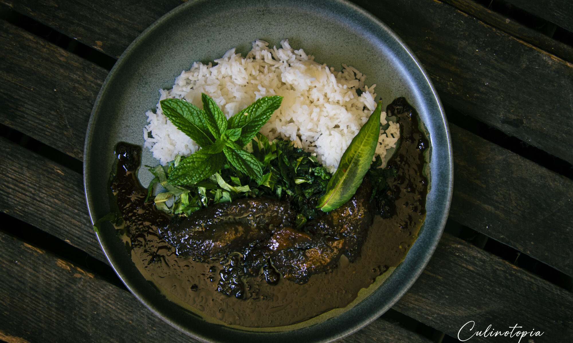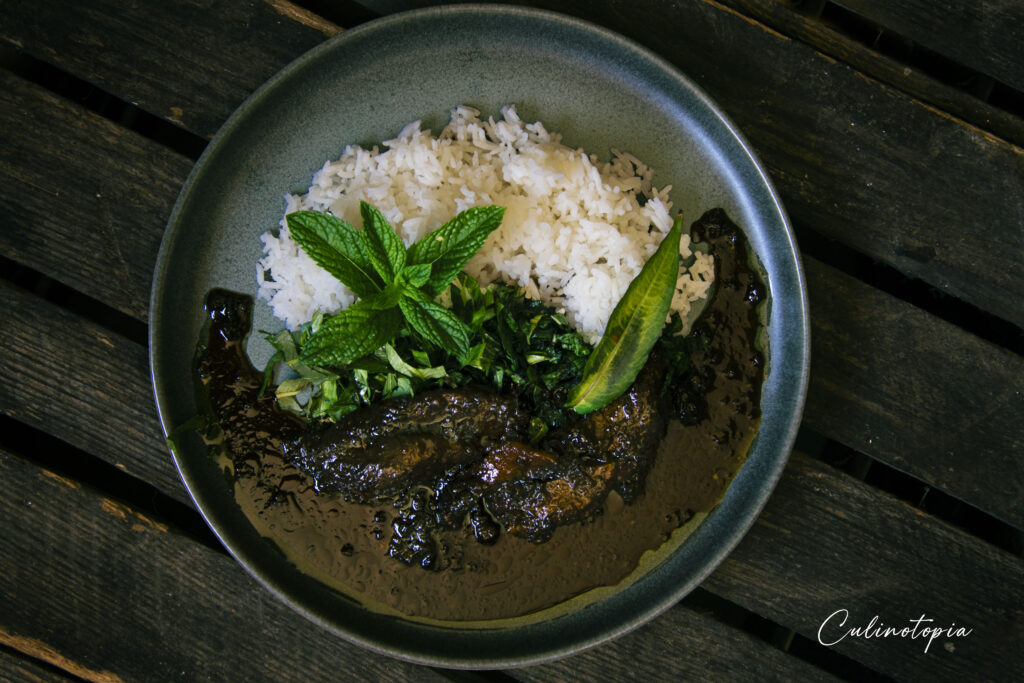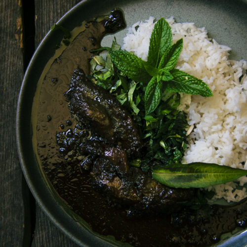 Ne vous fiez pas à cet amas noirâtre qu’on voit sur les photos 😂, c’est le mieux que j’ai pu faire niveau prise de vue. Si l’extérieur de la viande est bien foncé, elle n’est pas cramée, et l’intérieur révèle une chair tendre et blanche. Si vous aimez les plats pimentés, n’hésitez pas à doubler la dose de piment. Le plat est assez sucré (vu la quantité de sucre qu’il renferme, c’est plutôt normal). Mais la salade d’herbe fraîche est un merveilleux contrepoint à cette douceur, et le riz la complète parfaitement.