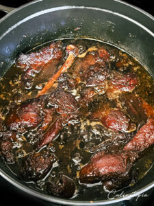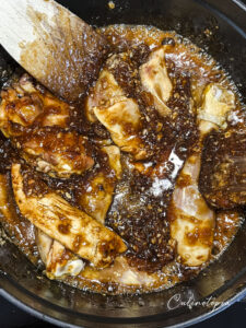 - Quand le poulet est bien caramélisé de tous côtés, déglacer avec le nuoc mam. Passer sur feu doux, couvrir et laisser mijoter pendant 2 à 3 heures, en remuant régulièrement, jusqu'à ce que les morceaux de poulet soient fondants.