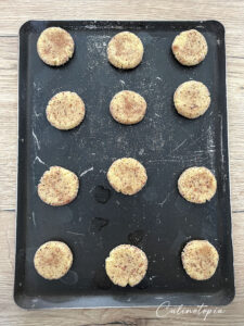 - Le lendemain, sortir la pâte et confectionner des boulettes de pâte de la taille d'une noix. Les rouler dans le sucre floral, puis les déposer sur une plaque à pâtisserie, en les espaçant suffisamment.Les écraser à l'aide d'une spatule graissée (ou de votre paume toujours graissée).